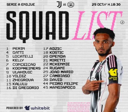 雷速体育10月29日报道宣称 北京时间10月30日凌晨1:30,尤文图斯将在意甲主场迎战乌迪内斯,赛前尤文官方公布了球队本场的大名单。其中队内的法国中场凯夫伦·图拉姆,缺席了本场比赛的大名单。