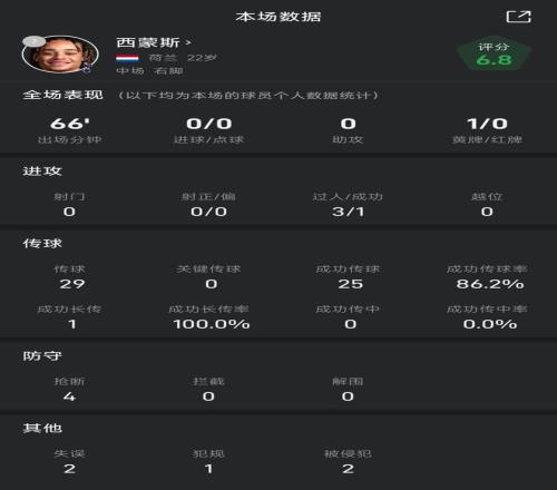 雷速体育11月2日报道宣称 在今天凌晨进行的热刺主场vs切尔西的英超比赛中,哈维·西蒙斯第7分钟替换上场表现平淡,在第73分钟被换下。