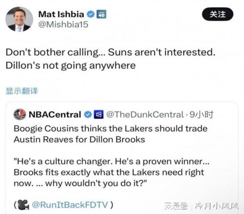 前不久,据多位记者报道,湖人正在和菲尼克斯太阳商讨一笔三换一交易,具体为湖人出八村塁、克内克特和一个首轮选秀权换太阳锋线球员狄龙布鲁克斯,湖人希望狄龙的到来能提升球队外线得分火力和侧翼防守能力。本赛季至今,狄龙布鲁克斯打出了生涯最佳的表现,累计出战29场,场均上场30.9分钟,得到21.4分3.1篮板1.7助攻1.3抢断,三项命中率为46.1%、34.3%和83.8%,其中场均得分、场均投篮数、命中数、投篮命中率均创下生涯新高。昨日,前nba球员考辛斯甚至建议如果太阳觉得筹码不够,湖人可以加入里夫斯。