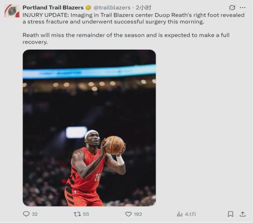 北京时间1月30日上午,开拓者官方宣布:球队中锋杜普-里斯右脚应力性骨折,今天顺利完成手术。里斯将缺席本赛季剩余比赛,2025-26赛季正式报销。本赛季至少有两个NBA中锋因应力性骨折而报销,另一个是独行侠的莱夫利。