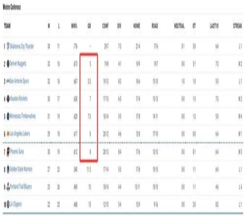 火箭跟马刺只差1.5个胜场,森林狼与火箭只差0.5个胜场,湖人距离森林狼0.5个胜场,太阳跟湖人没有胜场差,只要湖人输球/太阳赢球,那么湖人就会掉到附加赛。