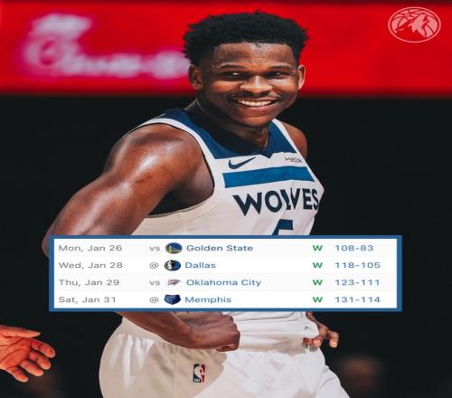 森林狼131-114大胜灰熊拿到四连胜,爱德华兹拿到33分3助攻,兰德尔27+7+7,麦克丹尼尔斯20+4,里德20分9篮板5助攻,森林狼这一波四连胜后已经稳稳压制湖人、太阳,他们险些跟火箭的胜场持平,但火箭击败独行侠后再度领先森林狼0.5个胜场。