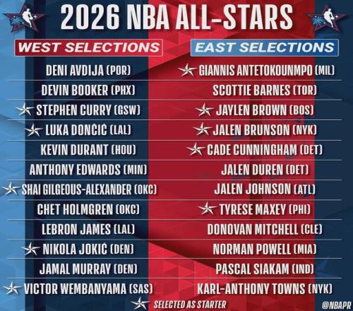 北京时间2月2日上午,NBA公布2026全明星替补阵容,由30支球队主教练投票选出。东部:米切尔(骑士)、鲍威尔(热火)、杰伦-约翰逊(老鹰)、西亚卡姆(步行者)、巴恩斯(猛龙)、唐斯(尼克斯)、杜伦(活塞)。