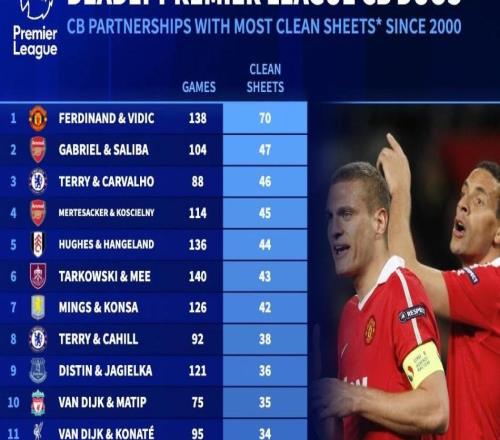 北京时间1月20日,德转列出了自2000年以来英超首发中卫搭档零封次数榜,曼联的里奥-费迪南迪和维迪奇以138场比赛零封70次断档领先,阿森纳的加布里埃尔和萨利巴47次零封第二,切尔