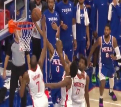 北京时间1月23日,NBA常规赛,76人对阵火箭的比赛进入加时赛。比赛末节最后时刻,双方115-115战平,76人后卫马克西持球突破冲进内线完成上篮,在篮球触碰到篮板后,火箭前锋杜兰特再次